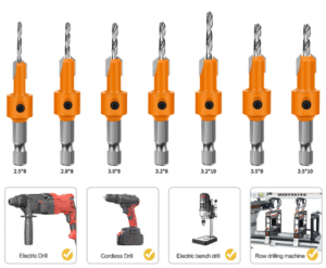 One popular brand for countersink bits is DeWalt, with their DeWalt DW1580 HSS Countersink Bit Set being widely used. The DeWalt DW1580-3/8 is a 3/8 inch diameter countersink bit with a 1/8 inch pilot drill. The tapered cutting edge is precision-ground to an 82-degree angle, matching standard wood screw heads, ensuring a perfect fit. The pilot drill is made from high-speed steel, drilling the main hole accurately, while the countersink cutting edge slices through wood to create a smooth, conical recess. The bit features a hex shank that fits securely in impact drills, preventing slippage, and it includes an adjustable depth stop to control the depth of the countersink, ensuring consistent results. DeWalt’s countersink bits are heat-treated for durability, making them suitable for frequent use in both softwoods and hardwoods.